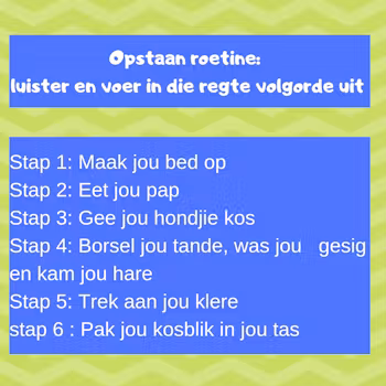 Onafhanklikheid in taakvoltooiing, organisering van werk, volg van instruksies, luistervaardighede.