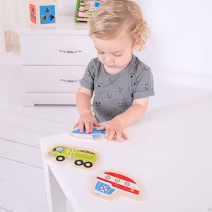 Gaan later oor na legkaarte. Wys eers vir hulle hoe jy ’n twee-stuk legkaart aan mekaar sit. Kyk, hier is die hond se kop. Die hond kort ’n lyf. Kom ons soek die lyf? Later gee jy net die hond se kop vir die kind en vra hy moet tussen al die stukkies daardie legkaart se maatjie soek. En voor jy weet begin hulle self bou. Sodra twee stukke bemeester is gaan dadelik oor na drie tot vier ens.